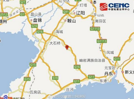 遼寧鞍山海城市發生4.4級地震,震源深度10千米