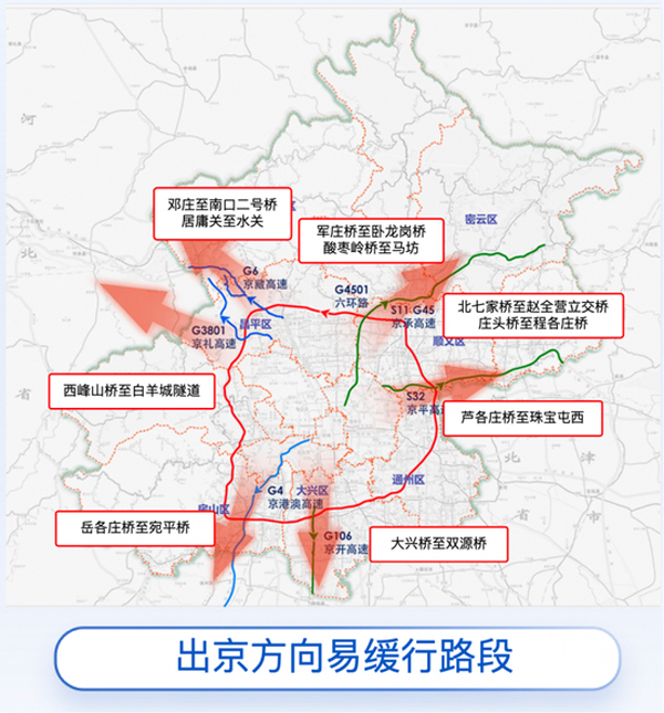 此外,9月30日下午15時起城市路網交通量將明顯加大,17時至19時路網壓力最為突出。城區東西部主要環路北向南,蓮石東路、通惠河北路、豐體南路等聯絡線,京藏、京承、京開、京港澳、機場高速等主要高速公路出京方向及六環路部分路段易出現車行緩慢。馬甸、西便門、月壇、朝陽門等區域交通壓力較大。