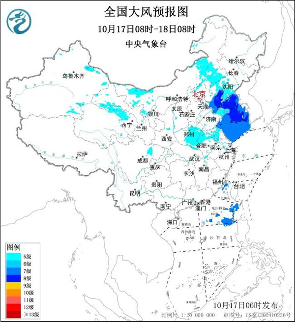 陸地方面:10月17日08時(shí)至18日08時(shí),新疆東部、內(nèi)蒙古東部和西部、青海北部、遼寧、山東中東部、河南中東部、安徽北部、江蘇西部和北部、四川盆地中部等地部分地區(qū)有4~6級(jí)風(fēng),陣風(fēng)7~8級(jí)。