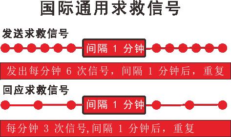 世界通用求救信號 求救信號:每分鐘6次,即2個三次,間隔1分鐘后重復 回應信號:每分鐘3次,間隔1分鐘后重復