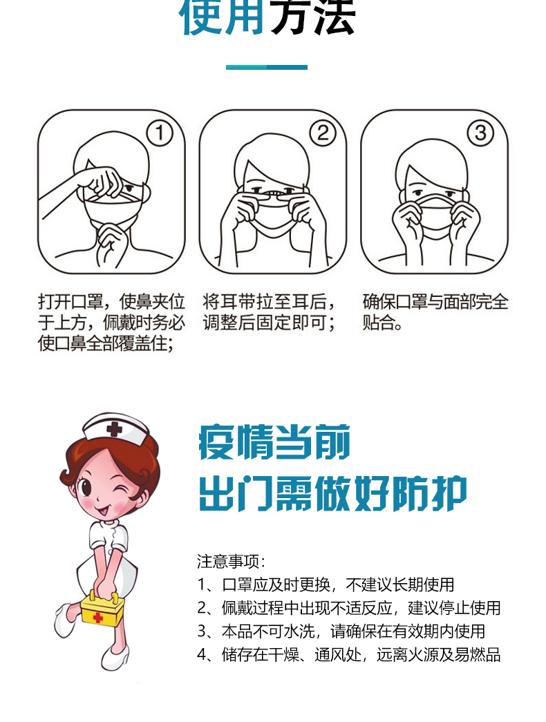 【適用范圍】一次性使用醫用口罩適用于佩戴者不存在體液和噴濺風險的普通醫療環境下的衛生護理。