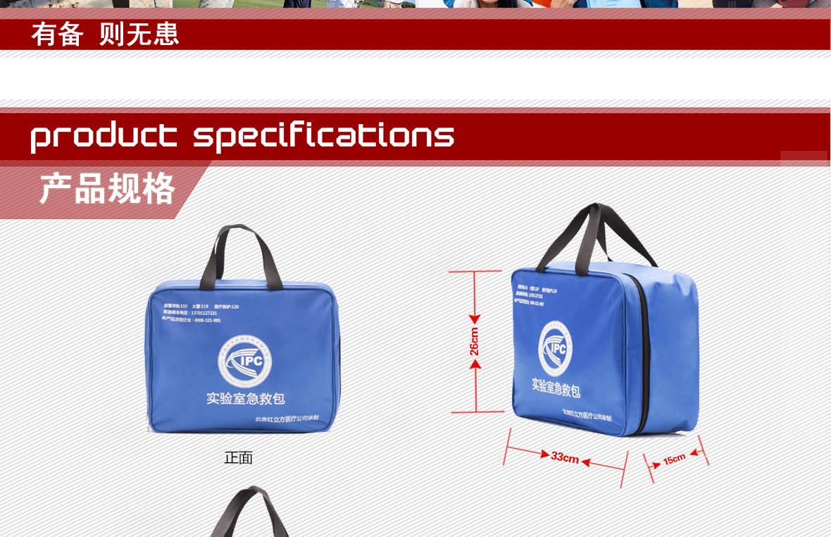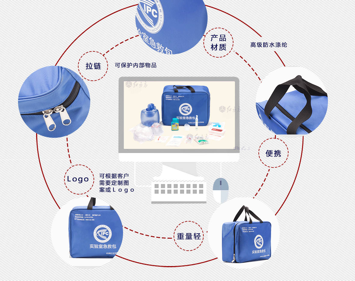 | 名稱:RCB-005A實驗室急救包 | 外包材質:滌綸 | 顏色:藍色 | ||||||
